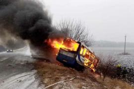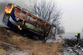 Утром 14 января в Днепропетровской области в результате столкновения с легковушкой загорелся рейсовый автобус. Водитель автомобиля погиб, еще два человека пострадали,